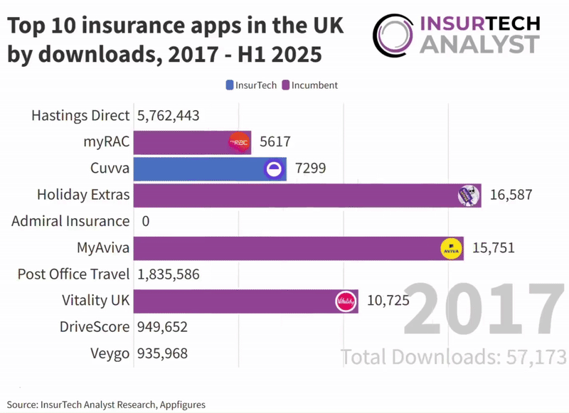 - Hastings Direct, a leading UK motor and home insurer, held the top spot for UK insurance app downloads from 2017 to H1 2025, amassing around 5.76m installs during the period