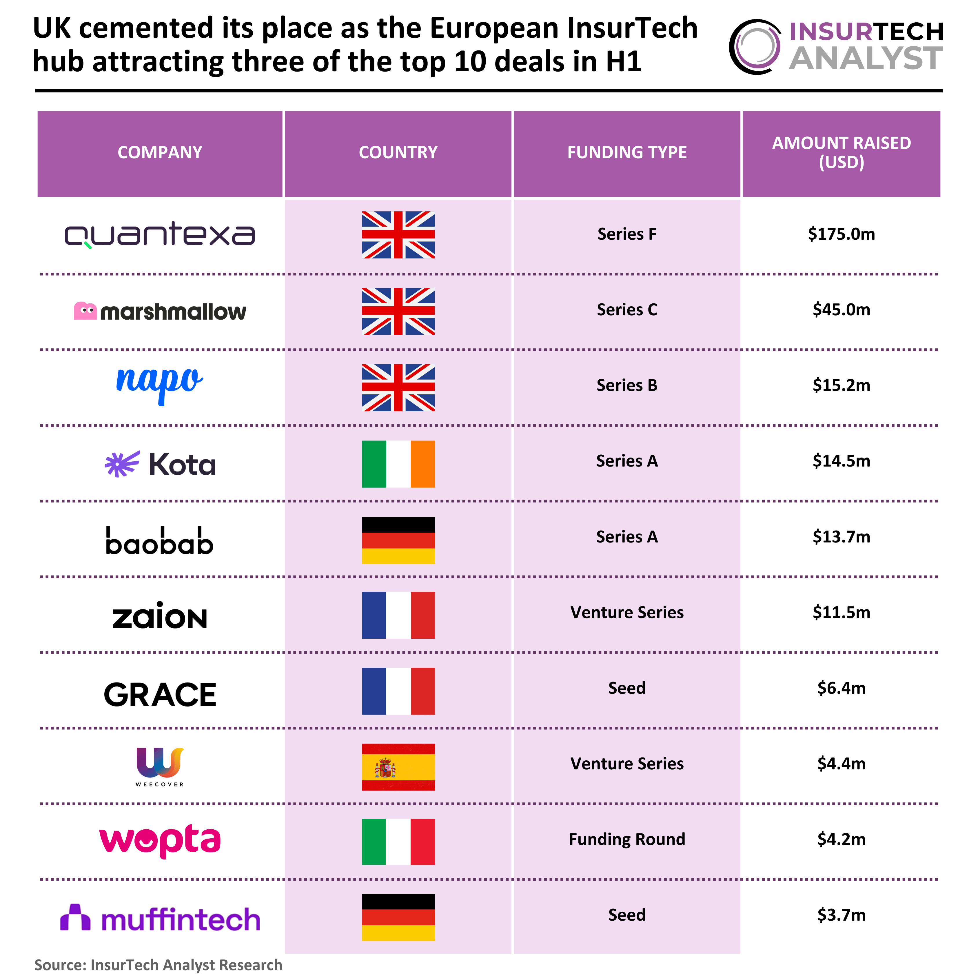 - Wopta, an Italian InsurTech MGA supporting businesses and professionals in protecting against everyday risks, is the only Italian company to feature in the top 10 European InsurTech deals in H1, with a $4.2m Series A funding round