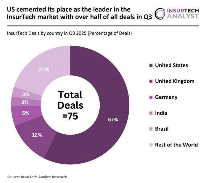 The US continued to dominate global InsurTech market, with companies in the country accounting for 43 deals (57% share) in Q3 2025, up 10% from the 39 deals (53% share) recorded in Q3 2024.